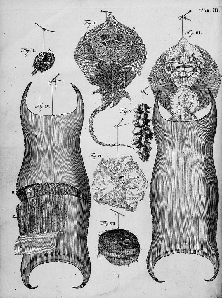 M0016628: Botanical and zoological preparations including the foetus of a ray, 1710. Public Domain Mark. Source: Wellcome Collection.